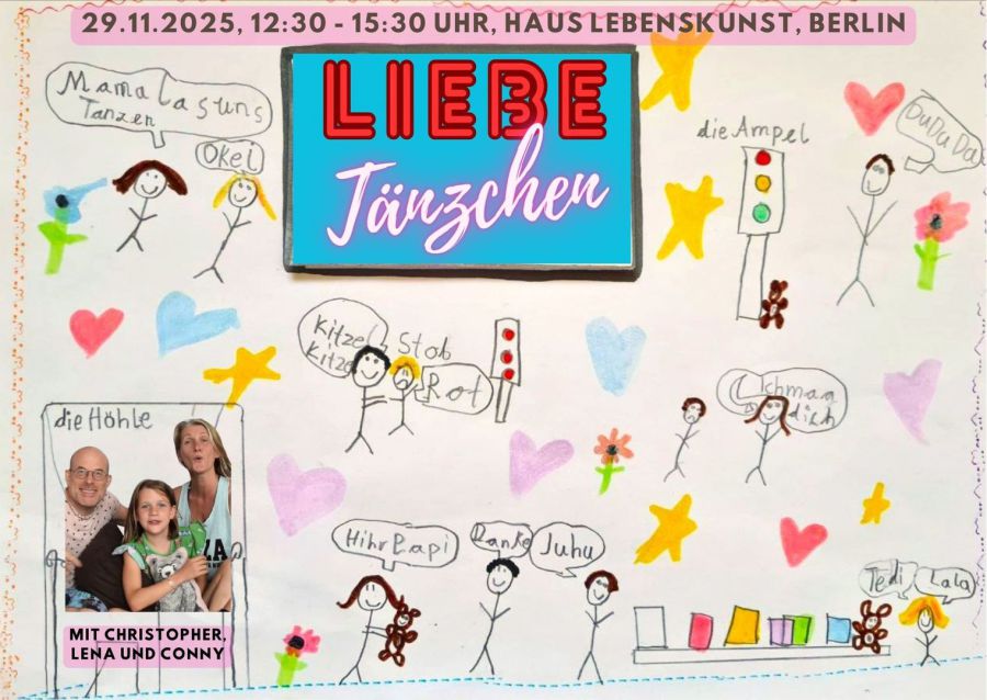 Am 29. November verwandelt sich das Haus Lebenskunst Berlin am Nachmittag in ein Paradies für Kinder, Familien und Erwachsene. Liebe Tänzchen, das kindgerechte Geschwisterchen von Liebe tanzen, lädt euch ein zu einem verrückten Nachmittag voller Bewegung und Begegnung!